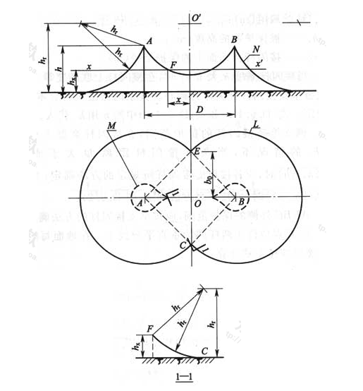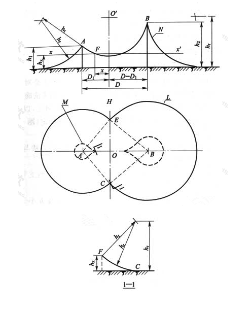 1)在任一保護高度hx和C點所處的垂直平面上,以hx作為假想接閃桿,按單支接閃桿的方法逐點確定(圖D.0.3的1-1剖面圖)。