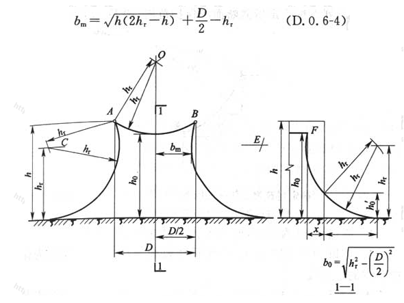 為半徑作圓或弧線,與各兩支接閃桿在外側所作的保護范圍載面組成該保護范圍截面(圖D.0.4中虛線)。