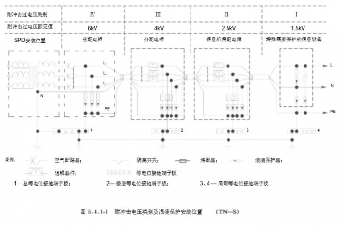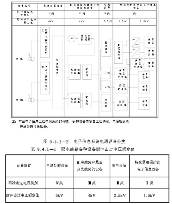 3.配電線路設(shè)備的耐沖擊過(guò)電壓額定值應(yīng)符合表 5.4.1-1規(guī)定. 電子信息系統(tǒng)設(shè)備配電線路浪涌保護(hù)器安裝位置及電子信息系統(tǒng)電源設(shè)備分類示意如圖5.4.1-1和圖5.4.1-2所示。
